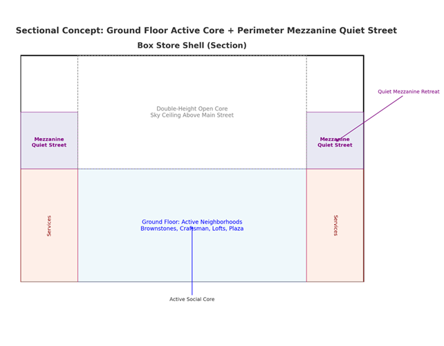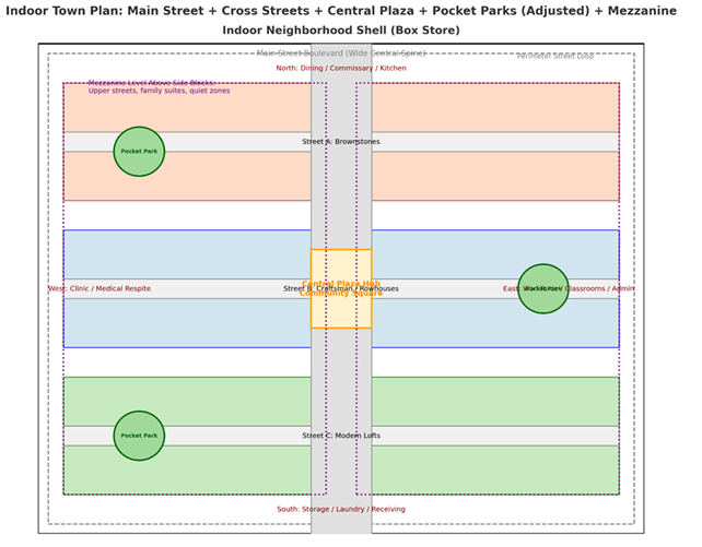 - Mezzanine Ring — second-level quiet street above the perimeter; designed as calmer, long-term or trauma-sensitive housing.